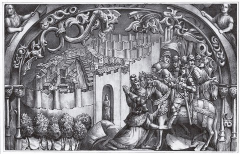 ciudad, Alhaquin, que besa la mano del rey Fernando montado a caballo; con el